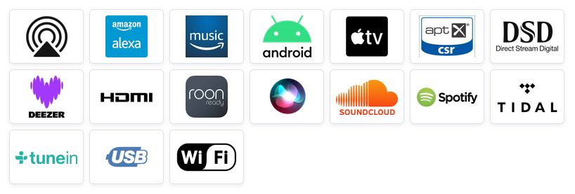 - Spotify Connect, Deezer Premium, SoundCloud, Tidal