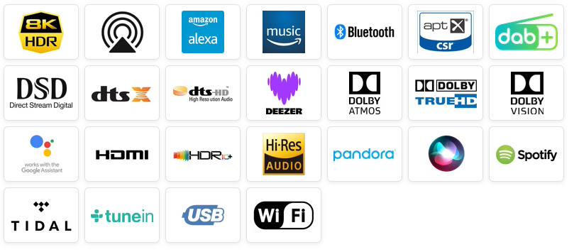 Wideo 8K jest obsługiwane przez trzy z sześciu wejść HDMI i dwa wyjścia. Ciesz się łatwą kompatybilnością wideo i doskonałą jakością obrazu dzięki HLG, HDR, Dolby Vision, HDR10+ i Dynamic HDR pass-through.