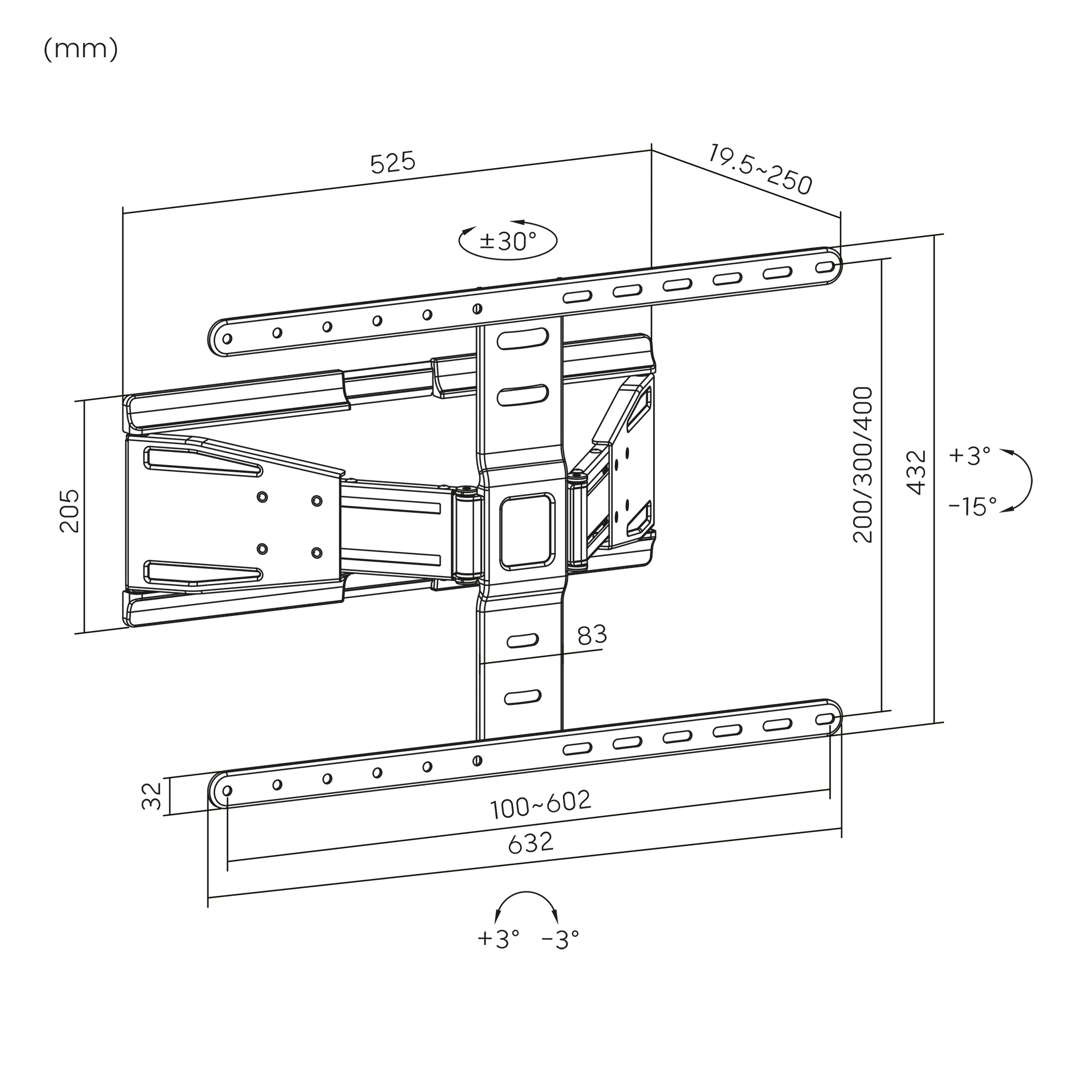 - Odległość od ściany: 19,5 ~ 250 mm
