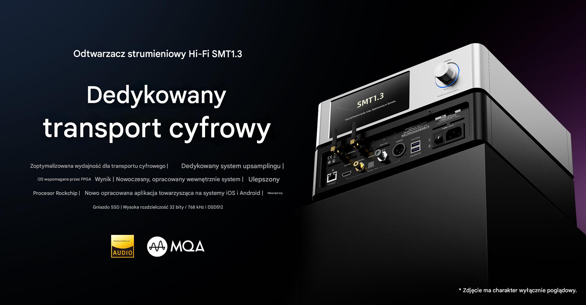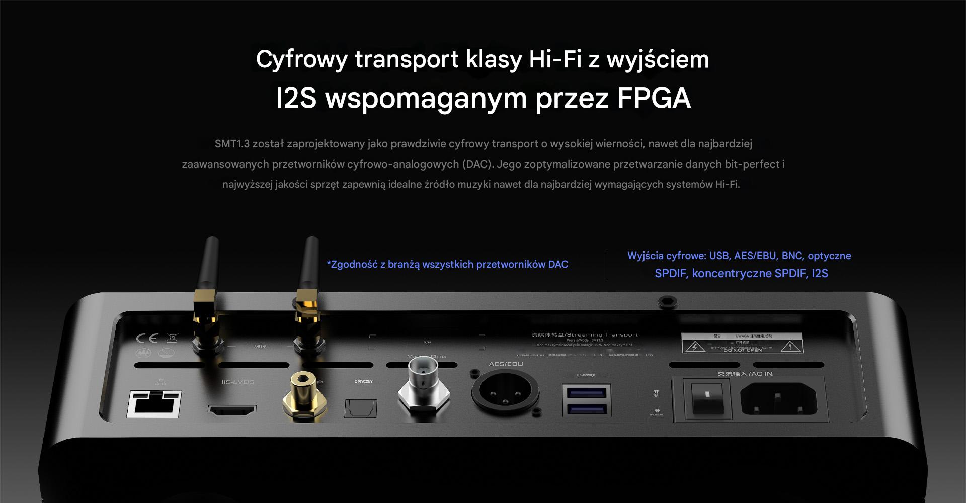 SMT1.3 to wysokiej klasy transport cyfrowy, który wyposażony jest w aż 6 wyjść audio. Ma on złącza USB, AES/EBU, BNC, optyczne, koaksjalne oraz konfigurowane I2S - za sprawą wykorzystania układu FPGA do obsługi I2S możliwe jest korzystanie z 10 różnych schematów połączenia dla złącza HDMI. Producent zadbał do tego o przetwarzanie danych bit-perfect oraz topowej klasy podzespoły. Dzięki temu SMT1.3 nie tylko współpracuje z niemal każdym przetwornikiem C/A, ale może być źródłem muzyki nawet dla high-endowych systemów Hi-Fi.
