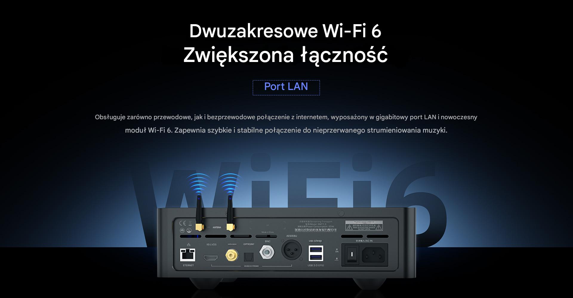 SMT1.3 wspiera zarówno przewodowe, jak i bezprzewodowe połączenie z siecią. Wyposażony jest w złącze Gigabit LAN (Ethernet) oraz dwuzakresowy moduł Wi-Fi 6 (2,4 GHz/5 GHz), co gwarantuje stabilne połączenie i wydajny streaming muzyki.