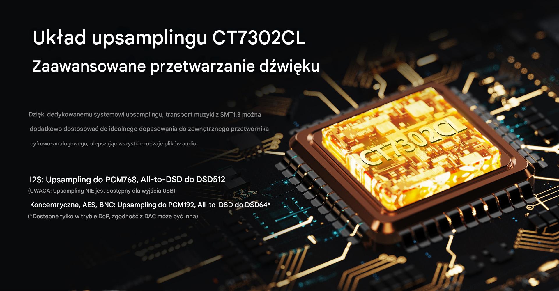 Shanling wyposażył streamer SMT1.3 w funkcje upsamplingu, która oparta jest na układzie CT7302CL. Umożliwia ona podniesienie częstotliwości próbkowania plików PCM do 768 kHz i korzystanie z opcji All-to-DSD do DSD512 dla wyjścia I2S oraz PCM do 192 kHz i All-to-DSD do DSD64 dla wyjść koaksjalnego, BNC i AES/EBU (upsampling nie jest wspierany dla wyjścia USB).