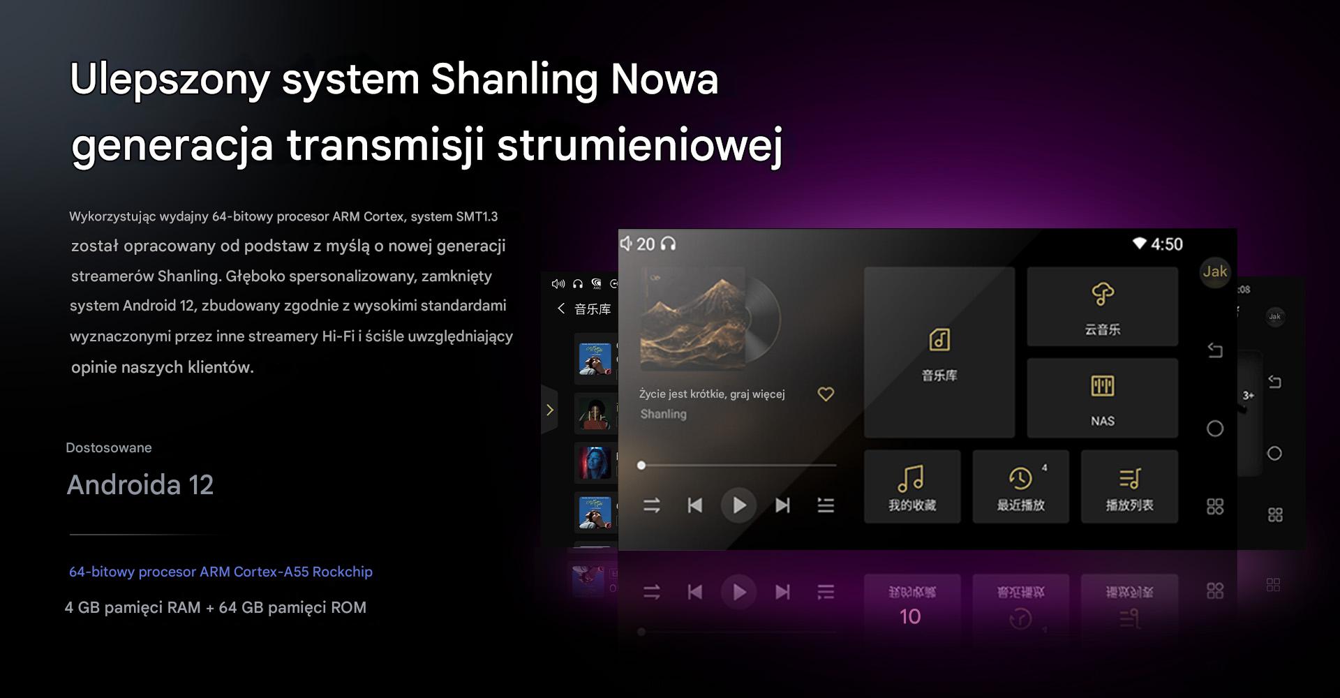 Streamer SMT1.3 - wzorem SM1.3 - oparty jest na ulepszonym, 64-bitowym procesorze ARM firmy Rockchip z rdzeniami Cortex-A55, który współpracuje z 4 GB pamięci RAM. Połączenie to gwarantuje wydajną i bezproblemową obsługę autorskiej, przygotowanej od zera platformy firmy Shanling. Bazuje ona na systemie Android 12, który został dogłębnie zoptymalizowany w oparciu o standardy wyznaczone przez inne streamery Hi-Fi i oczekiwania użytkowników.