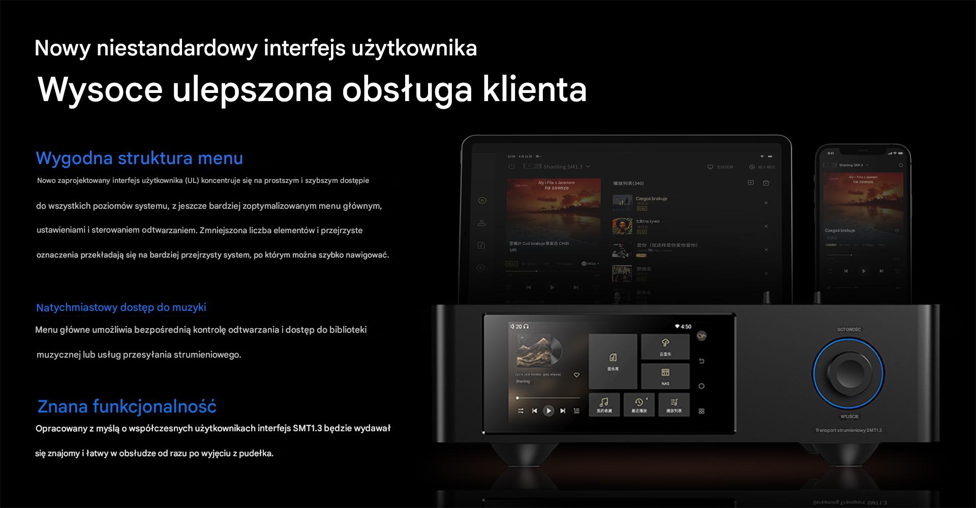 SMT1.3 ma nowy interfejs użytkownika, który jest zaprojektowany, aby dawać błyskawiczny dostęp do poszczególnych elementów systemu. Zoptymalizowano wygląd menu głównego, panel ustawień czy kontrolę odtwarzacza, aby były one przejrzyste i czytelne. Streamer umożliwia do tego natychmiastowe przejście do muzycznej biblioteki, ulubionych utworów i list odtwarzania, usług streamingu czy pamięci sieciowych.