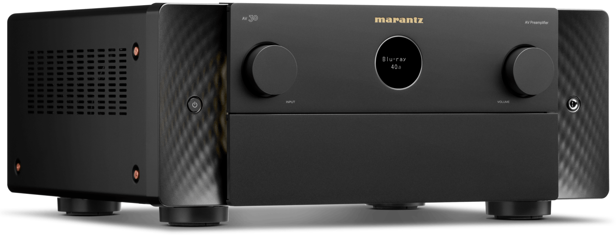 Marantz AV 30 kontynuuje charakterystyczną linię wzorniczą producenta: elegancki front, subtelne podświetlenie i staranne wykonanie. To urządzenie, które dobrze prezentuje się w salonie, a jednocześnie pozostaje funkcjonalne podczas konfiguracji i codziennego użytkowania. Czytelny panel oraz logiczne podejście do sterowania ułatwiają obsługę nawet w rozbudowanych systemach, gdzie liczy się szybki dostęp do ustawień i stabilna praca całej instalacji.