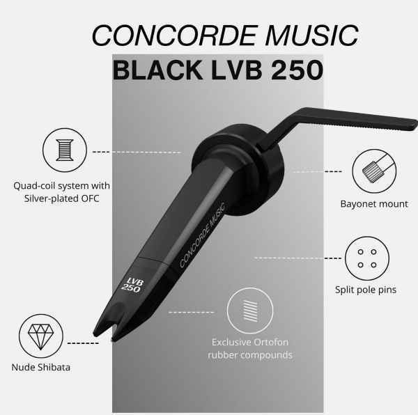Concorde Music Black LVB 250 wyposażona jest w igłę Nude Shibata zamontowaną na ramieniu z boru, co czyni ją najwyższej klasy wkładką MM w ofercie Ortofona. Opierając się na bogatym dziedzictwie zapoczątkowanym przez oryginalną wkładkę Concorde, Concorde Music ma bogatą historię jako jedna z najbardziej znanych wkładek w świecie audio.
