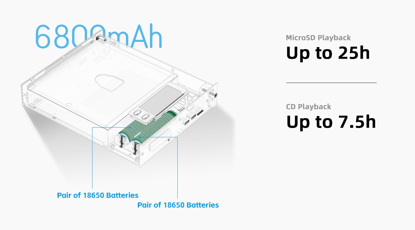 EC Mini został wyposażony w dwie baterie 18650, a więc rozwiązanie znane z modelu Shanling H7. Gwarantują one pojemność 6800 mAh, co przekłada się na długi czas pracy na jednym ładowaniu - do 25 godz. ciągłego odtwarzania muzyki z karty microSD oraz do 7,5 godz. odtwarzania płyt CD. Model ma do tego dedykowany port USB do ładowanie, dzięki czemu można go doładowywać nawet, gdy działa jako DAC USB lub cyfrowy transport.