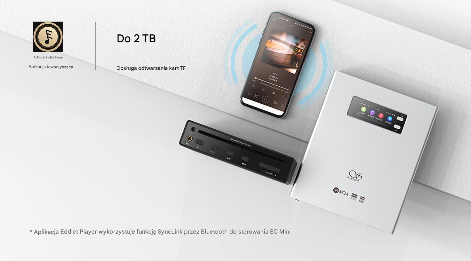 EC Mini może odtwarzać pliki bezpośrednio z karty microSD, wzorem przenośnych DAC/AMP-ów Shanling H5 i H7. Wystarczy włożyć kartę, aby móc przeglądać pliki z poziomu aplikacji towarzyszącej Shanling Eddict Player, która dostępna jest na Androida i iOS. Wspierane są pliki PCM do 32-bit/384 kHz oraz DSD do 256x. Program można wykorzystać również do zdalnej obsługi odtwarzacza CD.