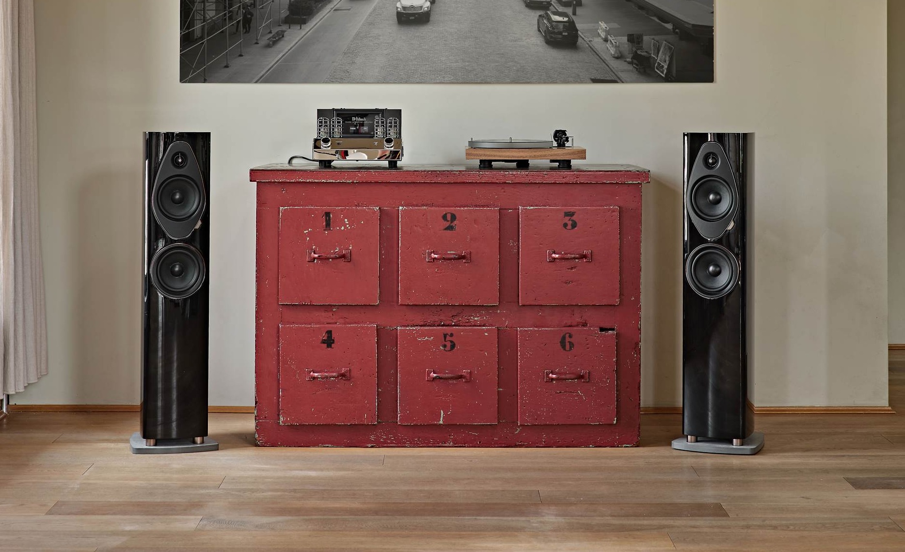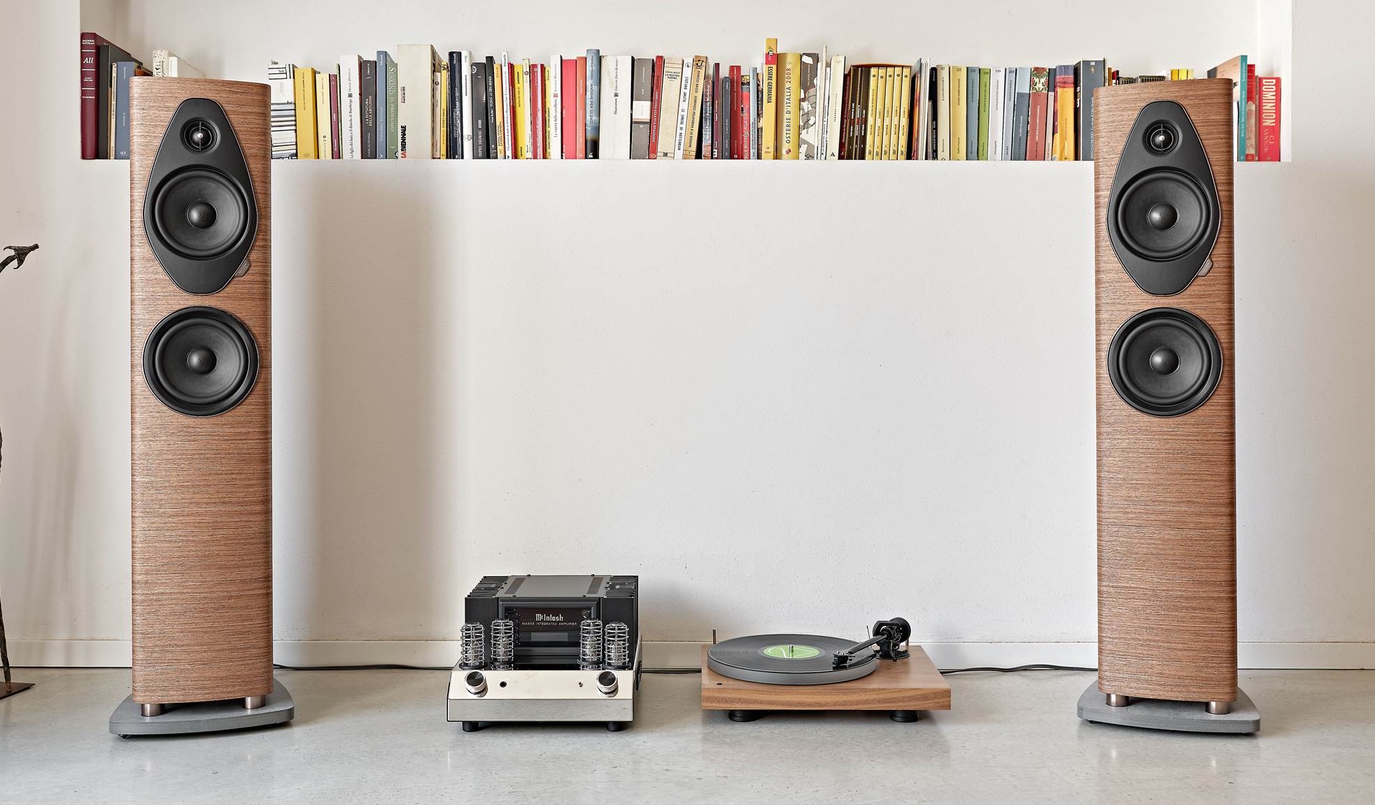 Sonetto III G2 to pełnowymiarowe kolumny podłogowe do klasycznego toru hi‑fi: wzmacniacza z wyjściami głośnikowymi oraz przewodów głośnikowych.