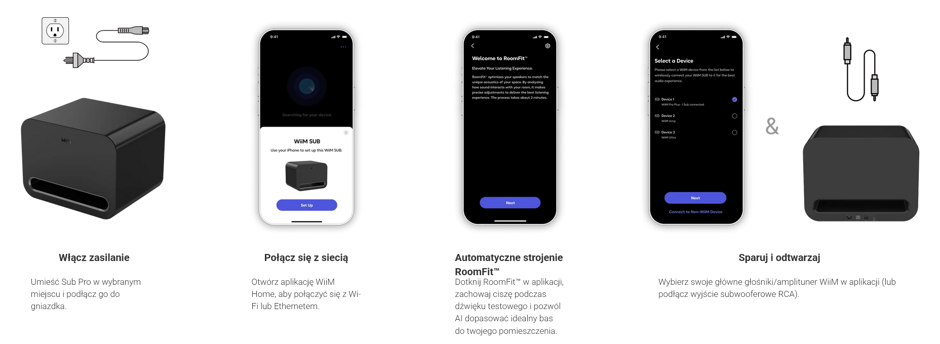 WiiM Sub Pro idealnie współpracuje z urządzeniami WiiM: streamerami, wzmacniaczami i głośnikami, a także może być podłączony do zewnętrznych systemów audio dzięki wejściu RCA. Subwoofer automatycznie przełącza się w tryb czuwania i wykrywa sygnał RCA lub podłączenie przewodu, co pozwala oszczędzać energię oraz ułatwia codzienne użytkowanie bez konieczności ręcznej obsługi.