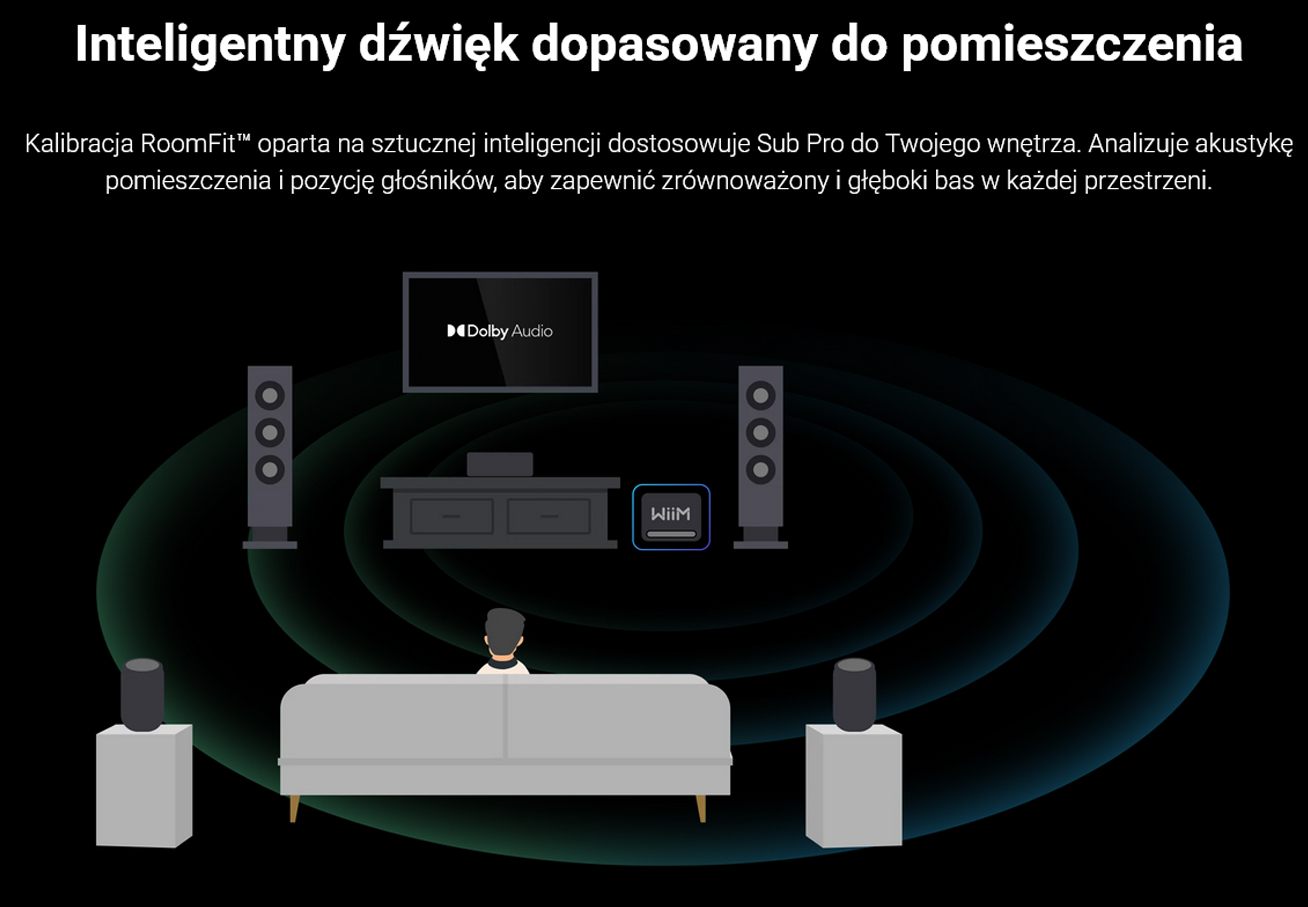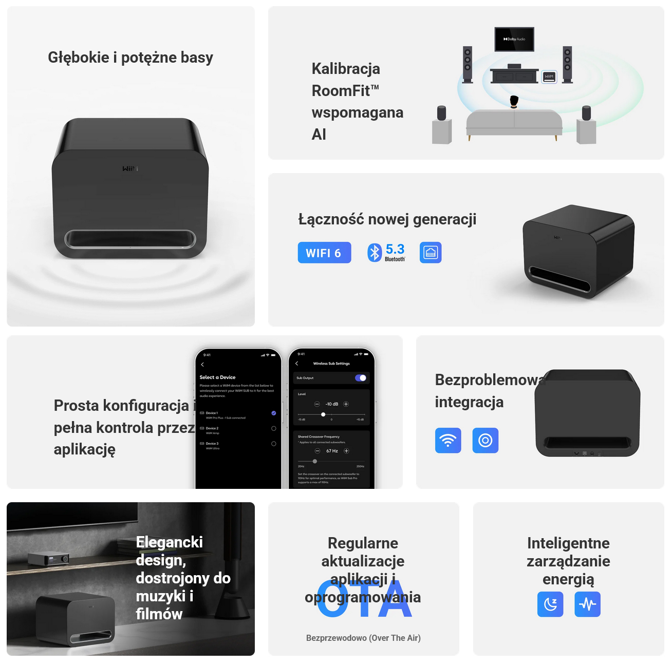 Elegancki i kompaktowy subwoofer aktywny z kalibracją RoomFit™ wspomaganą AI, oferujący głęboki i potężny bas w muzyce, filmach i grach, z łatwą konfiguracją oraz pełną kontrolą przez aplikację WiiM Home.