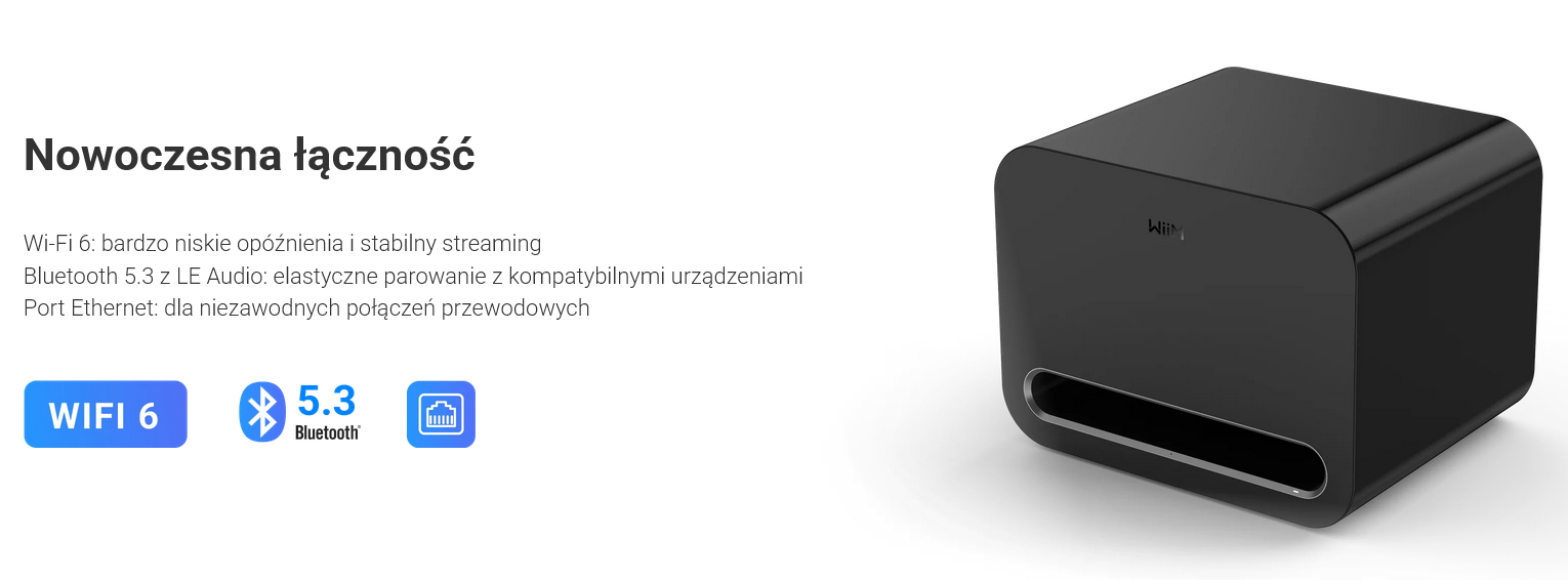 Sub Pro oferuje Wi-Fi 6, zapewniające niskie opóźnienia i stabilny streaming, Bluetooth 5.3 z LE Audio, umożliwiający elastyczne parowanie i port Ethernet pozwalający na niezawodne połączenie przewodowe. W aplikacji WiiM Home możesz dostosować 10-pasmowy korektor parametryczny, regulować częstotliwość podziału, fazę, poziom i opóźnienie oraz korzystać z gotowych presetów i narzędzi kalibracji, zyskując pełną kontrolę nad brzmieniem.