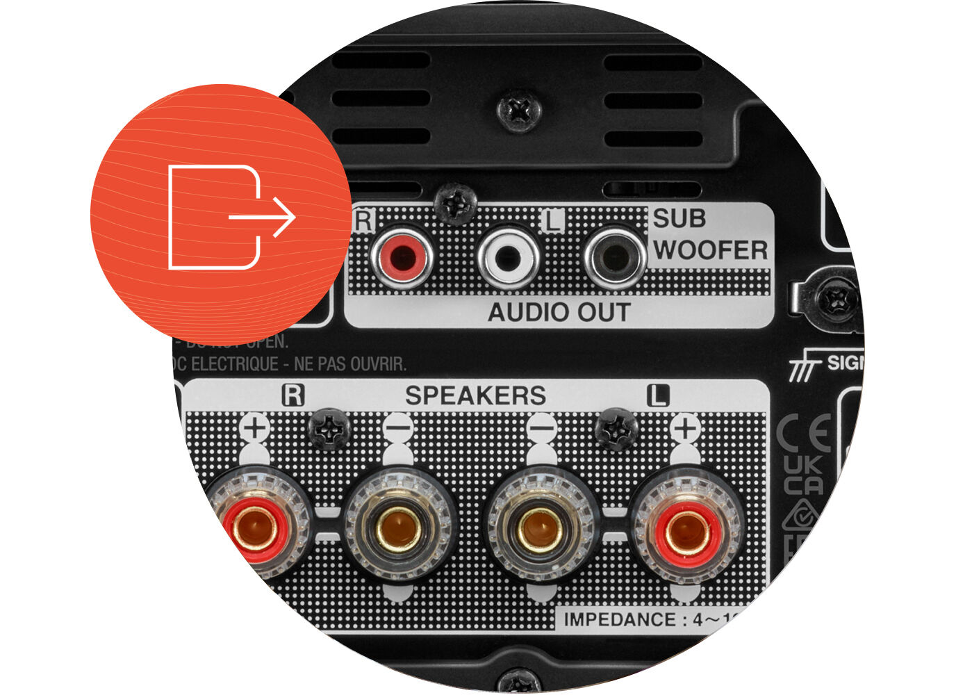 Dwa kanały o mocy do 65 W napędzają kolumny podstawkowe lub mniejsze głośniki podłogowe.