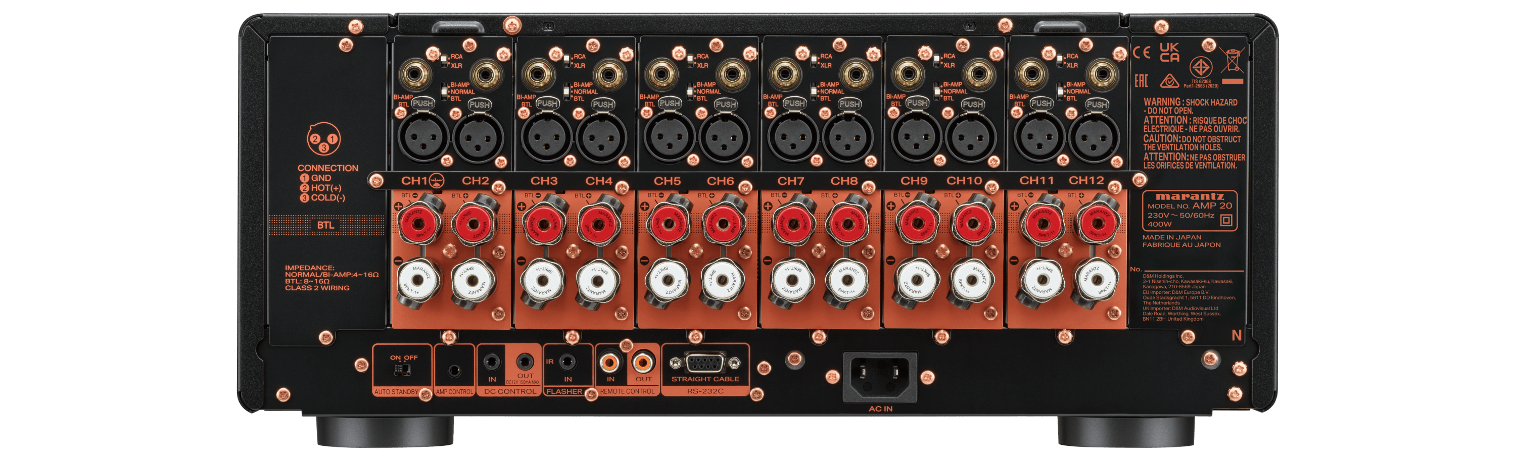 Marantz AMP 20 to referencyjny, 12-kanałowy wzmacniacz mocy klasy D, zaprojektowany z myślą o najbardziej wymagających entuzjastach kina domowego. Już od pierwszych taktów muzyki słychać charakterystyczne dla marki ciepłe, bogate brzmienie, które zawdzięcza dopracowanej przez Sound Mastera Marantz topologii HDAM-SA2. Każdy z dwunastu kanałów oferuje imponujące 200 W przy 8 Ω (a nawet 400 W przy 4 Ω), dlatego AMP 20 bez wysiłku napędza rozbudowane zestawy głośnikowe 7.4.6 lub 9.4.4, dostarczając dźwięk o niezwykłej dynamice i precyzji.
