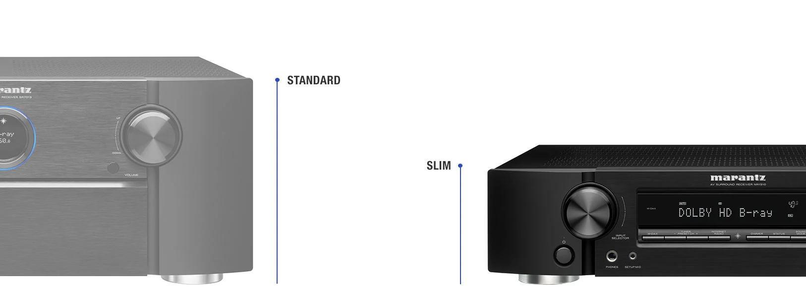 Smukły profil, wydajność Marantz, który jest o połowę niższy od tradycyjnego amplitunera AV, zapewnia wyjątkową wydajność i najbardziej muzykalny dźwięk.