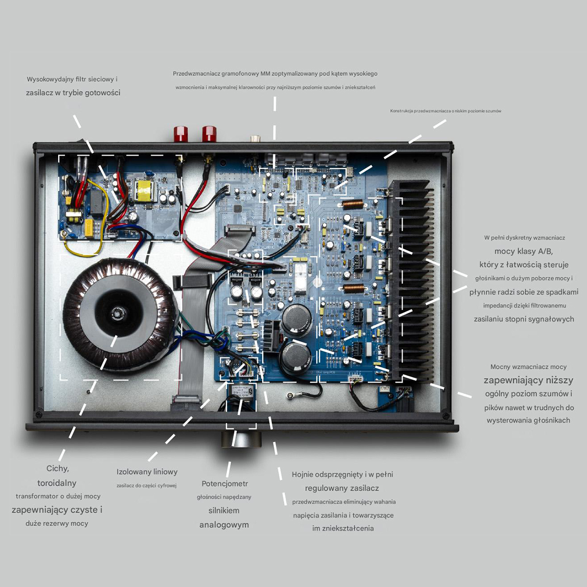 - Niezależne zasilanie przedwzmacniacza, wzmacniacza mocy i części cyfrowej