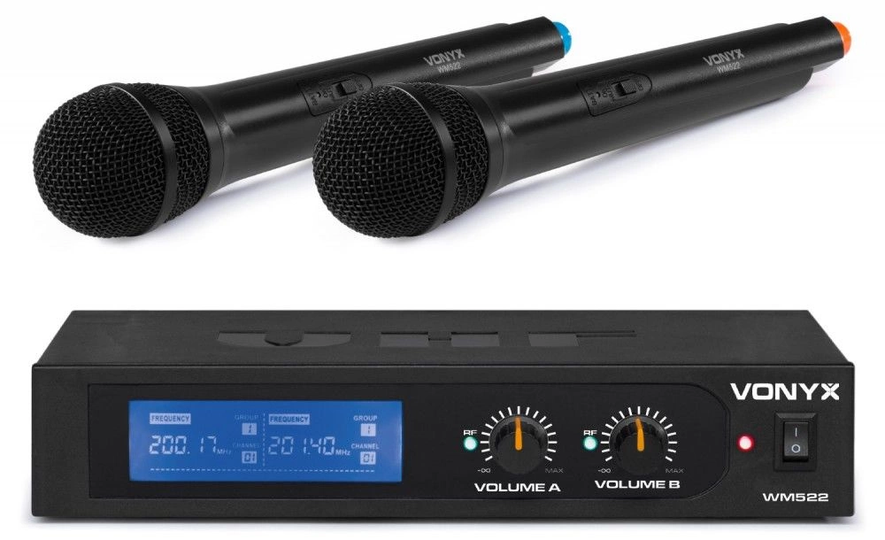 Vonyx WM522 to bardzo przystępny cenowo zestaw mikrofonów bezprzewodowych z dwoma doręcznymi mikrofonami bezprzewodowymi. System działa w paśmie VHF i oferuje dobrą jakość dźwięku oraz stabilną transmisję sygnału. Oba mikrofony mogą być używane jednocześnie, bez wzajemnych zakłóceń. Ten zestaw jest idealny do hobby lub użytku domowego z karaoke dla  początkujących DJ-ów, zajęć sportowych oraz przemówień itp.