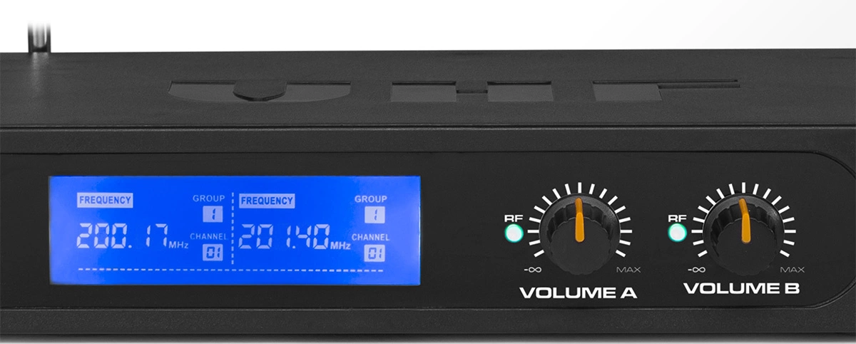 Przyjazny dla odbiorcy Odbiornik WM522 posiada wyświetlacz z niebieskim podświetleniem pokazujący używane częstotliwości.