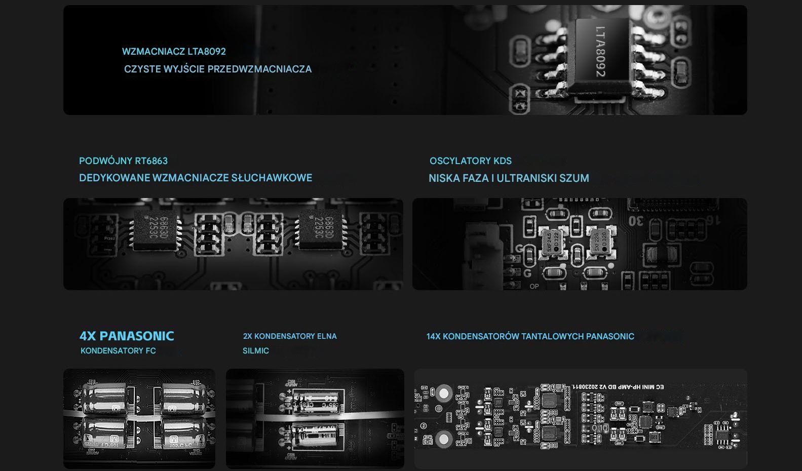 Świetną jakość dźwięku w EC Mini gwarantuje nie tylko układ DAC i wzmacniacz. Firma Shanling w obwodzie audio wykorzystała szereg komponentów, które odpowiadają za dobre brzmienie, w tym zegar oparty na dwóch niezależnych aktywnych oscylatorach kwarcowych o niskim poziomie szumu japońskiej firmy KDS, dwa topowe kondensatory ELNA SILMIC oraz 14 kondensatorów tantalowych i 4 kondensatory elektrolitowe firmy Panasonic. Producent zadbał dodatkowo o dedykowany wzmacniacz LTA8092 dla analogowego wyjścia przedwzmacniacza (RCA).
