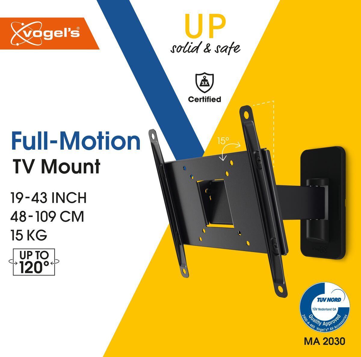 Z uchwytem Vogel’s MA 2030 nie przeoczysz żadnego szczegółu podczas oglądania swoich ulubionych filmów lub programów telewizyjnych. Dzięki funkcji pochylania, w zakresie od 0 do 15°, oraz możliwości obrotu telewizora, w granicach ±120°, z łatwością można wyeliminować wszystkie refleksy światła odbijające się w ekranie oraz skierować telewizor w stronę miejsca, w którym siedzą domownicy.
