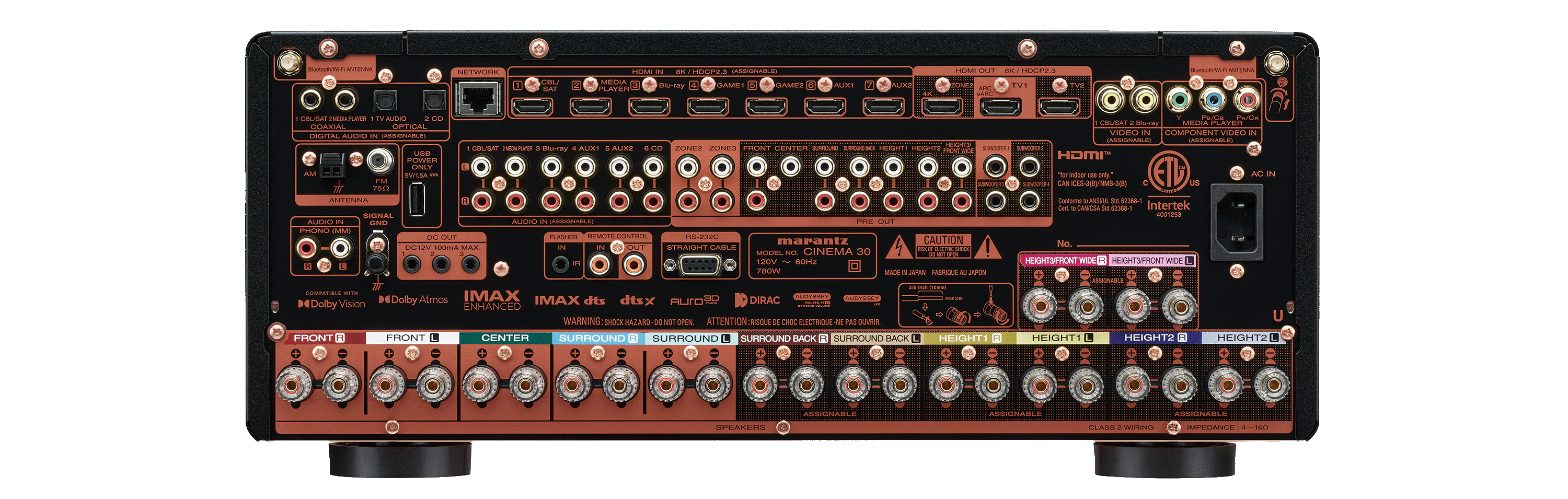 Kluczowe cechy i moc do wymagających zestawów Amplituner 11.4 kanałowy Marantz Cinema 30 oferuje 11 kanałów wbudowanej amplifikacji i duży zapas energii, co przekłada się na swobodę dynamiczną i kontrolę nad głośnikami.