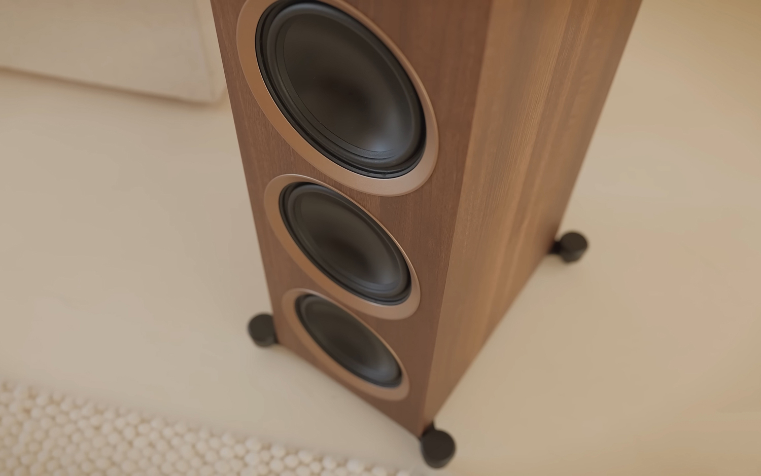 Modele podłogowe zostały zaprojektowane z regulacją wysokości za pomocą dołączonych gumowych nóżek lub kolców, co umożliwia użytkownikowi bezproblemowe wypoziomowanie głośnika w celu uzyskania stabilności na każdym podłożu.