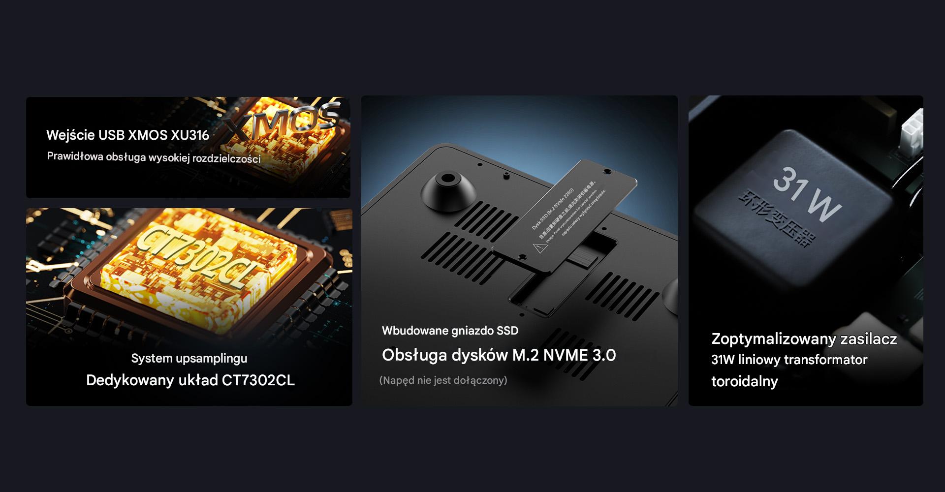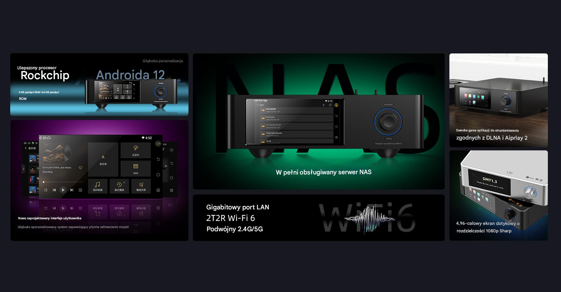 SMT1.3 pracuje na 64-bitowym układzie Rockchipa i ma 4 GB pamięci RAM, co przekłada się na płynne i bezproblemowe działanie. Streamer obsługuje łączność Wi-Fi 6 (2,4 GHz i 5 GHz) i ma port Gigabit LAN, a do tego wspiera technologie DLNA i Airplay 2. Urządzenie ma ponadto 64 GB wbudowanej pamięci, umożliwia instalację dysków M.2 NVME 3.0 i umożliwia dostęp do pamięci sieciowych NAS.