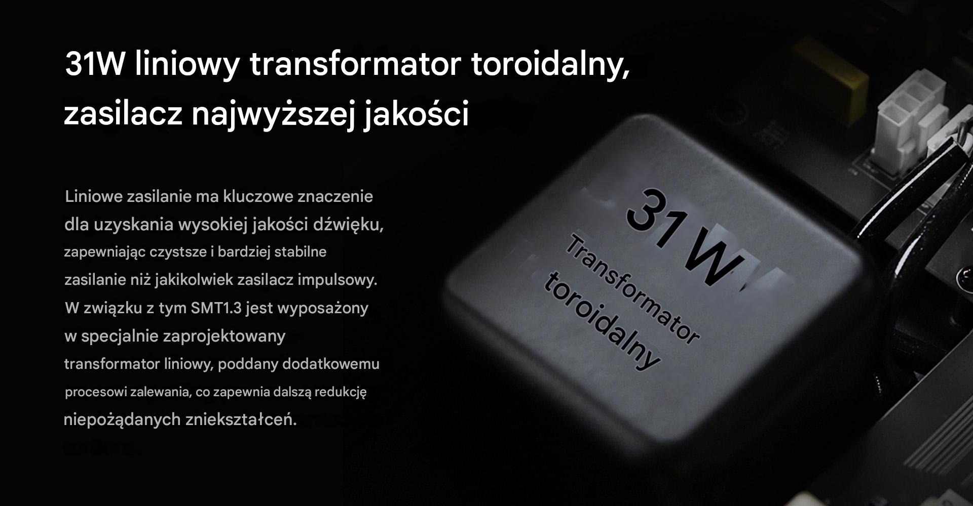 Zespół Shanlinga doskonale zdaje sobie sprawę, że zasilanie liniowe jest niezwykle istotne dla rozwiązań Hi-Fi. SMT1.3 ma więc system zasilania oparty na przygotowanym na zamówienie liniowym transformatorze toroidalnym 31 W, który gwarantuje czyste i stabilne zasilanie oraz redukcję niechcianych zniekształceń.