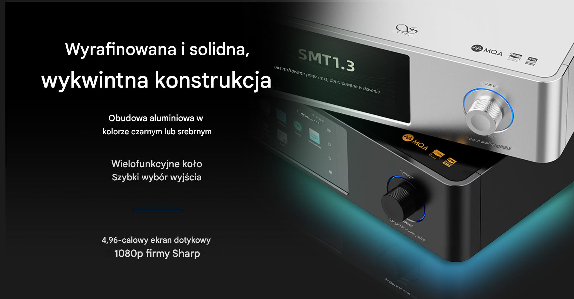 SMT1.3 ma obudowę o minimalistycznym, eleganckim wzornictwie, która doskonale pasuje do tych z popularnych odtwarzaczy SACD i CD Shanlinga, czyli modeli SCD1.3 i MCD1.3. Została ona wykonana ze stopu aluminium wysokiej jakości, co gwarantuje świetną wytrzymałość. Na jej przednim panelu umieszczono 4,96-calowy, dotykowy ekran FullHD i wielofunkcyjne pokrętło głośności z podświetleniem.